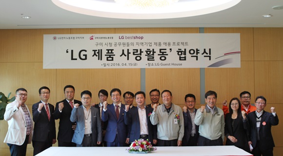 4월 15일 LG Guest House에서 이경문 구미시 공무원 노동조합 위원장, 신동국 수석부위원장, 백승경 부위원장, 최은희 여성부위원장, 최상윤 사무국장과 서성묵 LG전자 노동조합 구미지부장, 장기수 LG경북협의회 사무국장, 김대용 지점장외 LG하이프라자, Best shop 등 4개지점장 등이 참석한 가운데 ‘LG제품 사랑활동’ 협약식을 진행했다.