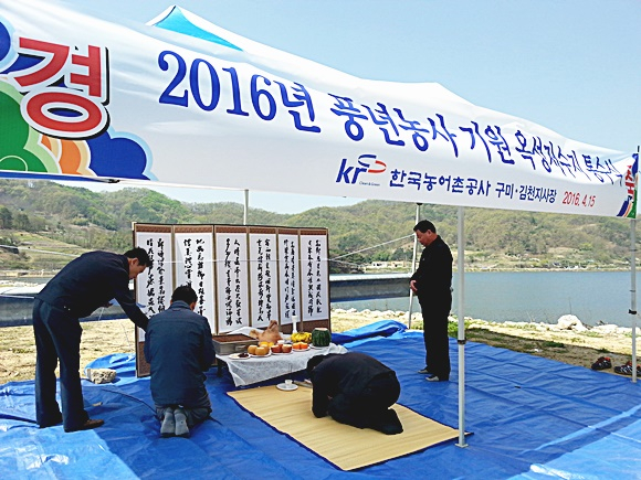 [구미IT뉴스] 한국농어촌공사 구미·김천지사는 4월 15일 본격적인 영농철을 맞아 구미시 옥성면 옥성저수지에서 구미시 농정과장, 쌀전업농회장 등 유관기관장 및 지역농업인 등 100여명이 참석한 가운데 ‘2016년 풍년농사 기원제 및 통수식’을 개최했다.