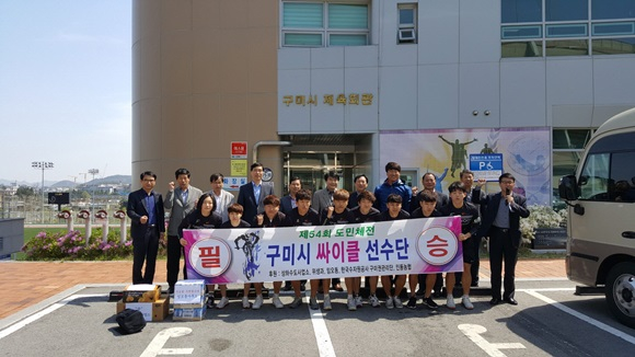 이날 사이클경기 출정식을 찾은 서포터즈단은 제54회 도민체전에서 우승을 달성하겠다는 각오로 땀방울을 흘리고 있는 선수들에게, “구미시를 대표하는 선수이니만큼 선수 한사람 한사람 각자 최선을 다해 구미시의 저력을 발휘하여 우승을 향해 달려가길 바란다.” 고 응원했다.