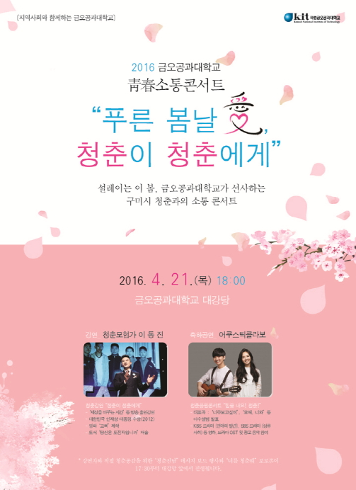 [IT뉴스]금오공과대학교가 사회 공헌활동의 일환으로 지역민과 대학생을 위한 ‘청춘(靑春) 토크 콘서트’를 개최한다. 오는 4월 21일(목) 저녁 6시부터 대학 본관 대강당에서 개최되는 이번 공연은 금오공대를 비롯해 구미대, 한국폴리텍대학 구미캠퍼스 등 지역 대학생과 시민을 대상으로 ‘푸른 봄날 愛, 청춘이 청춘에게’를 주제로 2시간여에 걸쳐 진행될 예정이다.
