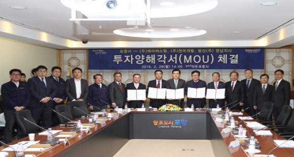 이날은 이강덕 포항시장, 이칠구 포항시의회 의장, 한진욱·정수화 시의원, ㈜케이써스틸 차원석 대표, 방산(주) 영남지사 방순만 대표, ㈜천마개발 김효경 대표이사 등 관계자 17명이 참석한 가운데 기업 사업계획 설명과 함께 포항시의 신속한 행정지원으로 빠른 기간 내 공장이 설립되도록 하는 투자협약을 맺었다.