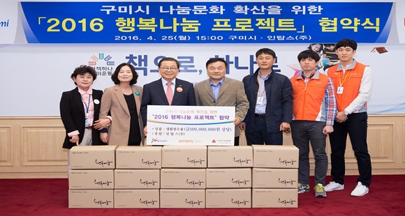 [구미] 구미시는 4월 25일 국제통상협력실에서 구미시 나눔문화 확산을 위한 인탑스(주)와 ‘2016 행복 나눔 프로젝트’ 협약식을 가졌다. 인탑스(주)의 행복 나눔 프로젝트 사업은 연간 1억 원 상당의 물품을 연3회 3,012가구(회당 1,004가구)에 전달하는 사회공헌 사업으로 무엇보다 물품을 직원들이 직접 구입하고 포장까지 하는 일체형 전달식으로 그 의미가 크다고 볼 수 있다.