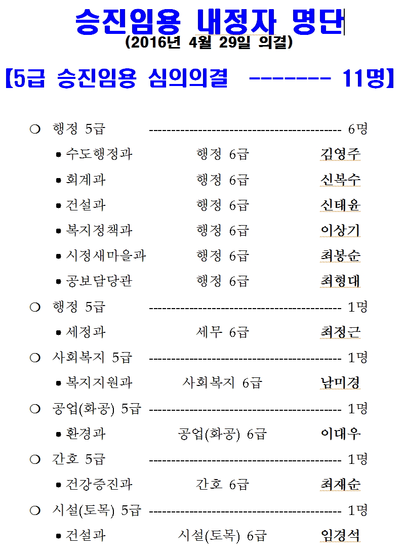 [경주] 경주시는 4월 29일자 5급 승진임용 내정자 명단을 다음과 같이 발표했다.