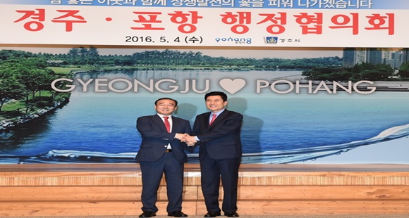 [경주] 경주시와 포항시는 유구한 역사를 간직한 형산강 젖줄을 근원으로 역사·문화·경제 등 다양한 분야에 상생발전을 위해 ‘2016 경주·포항 행정협의회 정례회’를 가지고 지속적인 협력 행보를 함께 하기로 했다.