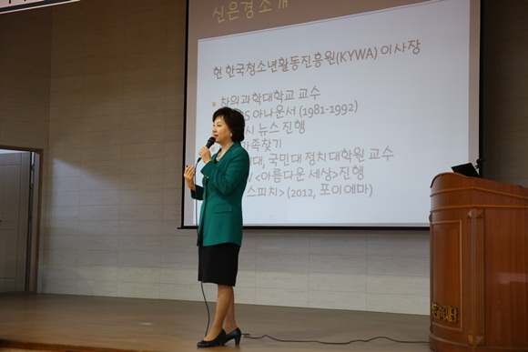 [영덕] 신은경 한국청소년활동진흥원(KYWA) 이사장이 영덕여고 대강당에서 5월 4일 ‘세상의 중심에 서다!’라는 제목으로 특별강연에 나섰다. 이번 강연은 교사, 학부모, 학생 총 300여명이 참석한 가운데 이뤄졌다.