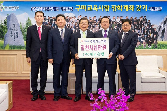 [구미] (재)구미시장학재단은 5월 4일 국제통상협력실에서 (주)대구은행 문홍섭 부행장 및 임원들과 대구회 윤정욱 회장이 참석한 가운데 장학기금 1천140만원을 기탁하는 뜻 깊은 자리를 가졌다.