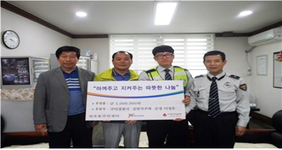 상대 차량 보험사로부터 받은 보상금 전액(일백만 원)을 지구대 사무실을 관할하는 구미시 임은동 주민센터에 불우 이웃돕기 성금으로 기탁해 지역사회의 귀감이 되고 있다.