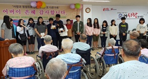 카네이션을 정성스럽게 만들어 요양 중인 어르신들의 가슴에 달아 드리고, 감사의 편지읽기, 주변청소 및 말벗되기, 간식 수발을 도왔다. 행사 마지막에는 ‘어버이은혜’를 부르며 어버이날을 축하했다.