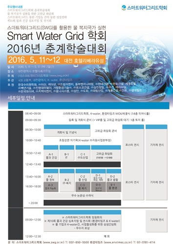 [대한인터넷신문협회] 스마트워터그리드학회와 환경타임즈(www.envtimes.co.kr)는 오는 5월11일 ~ 12일 1박 2일간 대전 유성 리베라호텔에서 2016년 춘계학술대회 및 제10회 물과 건강 심포지엄 및 전시회를 개최한다.