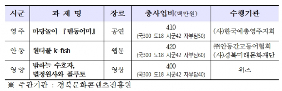 이로써, 도는 ‘원더풀 k-fish’, ‘마당놀이 덴동어미’, ‘밤하늘 수호자 – 별 정원사와 플루토’ 3개의 융복합 프로젝트를(프로젝트 당 국비 3억원) 추진한다.