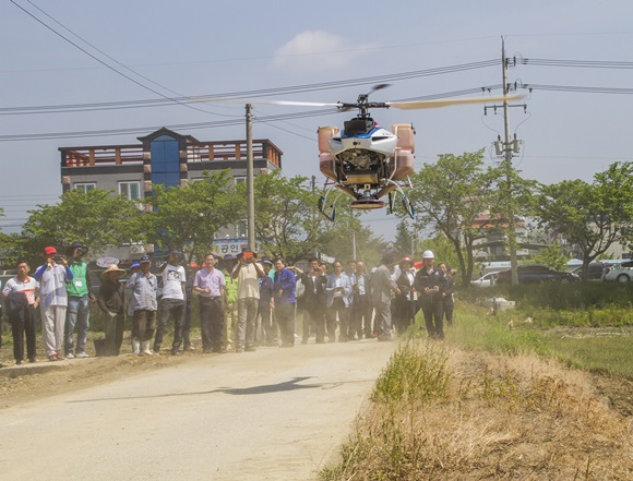 [안동] 안동시농업기술센터는 고령화시대 노동력 해소와 생산비 절감 등을 위해 무인헬기를 이용한 직파재배 연시회를 실시하고 농업경쟁력을 강화시켜 나가고 있다. 이와관련해 홍성대 기술센터소장외 관계자들은 5월 12일 안교들(0.6㏊)에서 연시회를 가졌다.