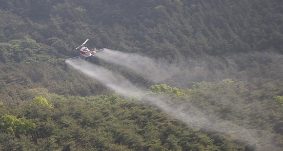 [경산] 경산시는 남산면 조곡리, 연하리의 일부 소나무림에 발생한 소나무 재선충병의 확산저지 및 완전방제를 위해 지난 5월 12일 항공방제(2차)를 실시했다.