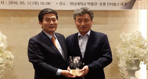 (사)우리문화재찾기운동본부 회장 박영석은 5월12일 호텔인터불고 회의실에서 2016국외소재 우리문화재 찾기운동 추진 상황보고회에서 환수기금1천만 원을 기탁 및 업무추진에 협조가 많은 사공득 태령종합건설(주) 대표이사에게 감사패를 전달했다. |