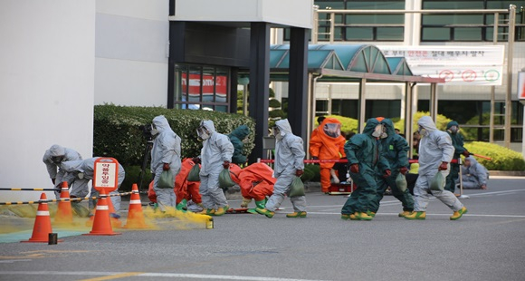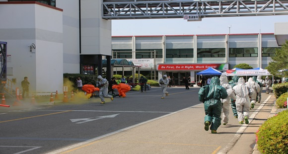 이번 훈련은 구미 국가산업단지 내 LG전자(주) 솔라 구미공장에서 염산 공급 중 화재 폭발로 염화수소가 유출돼 인명 피해가 발생한 상황을 가정했으며, 인명 구조, 주민 대피, 사고 확대 방지, 오염원 제독 등에 중점을 두고 진행됐다.