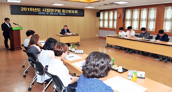 [경산] 경산시는 5월 25일 시청 상황실에서 공무원들의 자발적 참여로 구성된 시정연구팀의 연구과제 중간보고회를 개최했다. 이 날 보고된 연구과제는 공연문화산업 육성 방안, 관내 대학과 연계한 어르신대학, 아동학대 예방 방안, 압독국 역사테마관광조성 및 주변 관광자원 벨트화, 은퇴노인 보금자리 조성, 경산대추 유통 활성화 방안, 경산시 관광산업 활성화를 위한 시티투어버스 도입, 감염병 예방 및 관리방향 연구, 저탄소 녹색도시 조성을 위한 방안 등 총 9개의 시정발전 과제로 각 팀별로 자율적으로 선정했다.