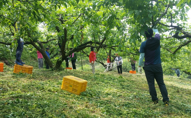 [김천] 한창 바빠지는 농촌지역의 영농철 일손 부족을 조금이나마 해소하고 더 나아가 적극적인 농작업 체험을 통해 직원들 화합을 도모하고자 매년 시행하는 ‘농촌 일손돕기 행사’가 5월 26일, 27일 양일간 종합민원과(7명)·농촌지도과(7명)·조마면(9명) 직원들의 참여로 신곡1리 독거농가 자두밭에서 이뤄졌다.