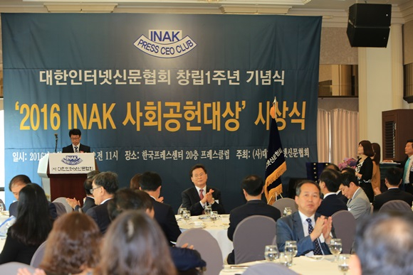 (사)대한인터넷신문협회(회장 이치수, www.inako.kr, www.inako.org)는 창립 1주년을 맞아 5월 31일 한국프레스센터에서 기념식 및 ‘2016 INAK 사회공헌대상’ 시상식을 함께 개최했다.