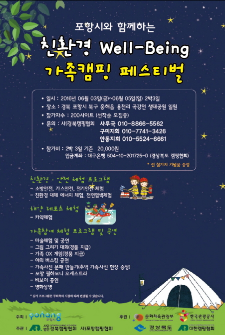 자녀교육을 겸한 친환경 생활용품만들기 체험과 환경살리기 및 안전캠페인, 안전OX게임, 곡강천변 쓰레기수거 등 체험프로그램을 비롯해 영일대해수욕장과 죽도시장, POSCO 등 관광지 연계투어, 카약체험, 가족사랑 콘서트, 음식경연, 그림 그리기대회 등 다채로운 체험형 야영프로그램이 운영된다.