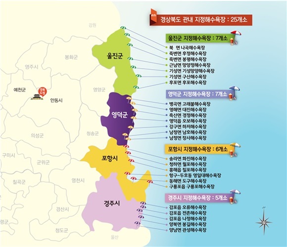 첫 개장은 포항 영일대 해수욕장이 오는 6월 7일 조기개장을 필두로 6월 25일 포항시 관내 나머지 5개소 해수욕장이 먼저 개장을 하고 이어서 7월 15일 경주시, 영덕군, 울진군 관내 19개소 해수욕장이 일제히 개장을 한다.