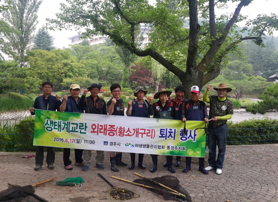 이에 경주시와 (사)야생생물관리협회 동경주지회 회원 등 20여명은 6월 12일 경주보문관광단지내 보문정 일원에서 생태계 교란 외래종인 황소개구리 퇴치 행사를 가졌다.