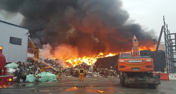 [경주] 경주시 강동면에 소재한 한 폐기물처리업체에서 6월 16일 04시 50분경 화재가 발생해 소방대원이 신속히 출동하여 화재진압 및 인명구조 활동에 나섰다.
