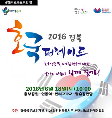 [안동] 경북북부보훈지청과 6·25참전경북도지부·안동시보훈단체연합회는 호국보훈의 달을 맞아 우리나라를 지켜준 호국영웅을 기억하고 감사함으로써 하나된 대한민국을 향해 나아가는 계기를 마련하기 위해 안동시 웅부공원에서 탈춤공연장까지 약 2.1㎞를 걷는 ‘2016 경북 호국 퍼레이드’행사를 개최한다.