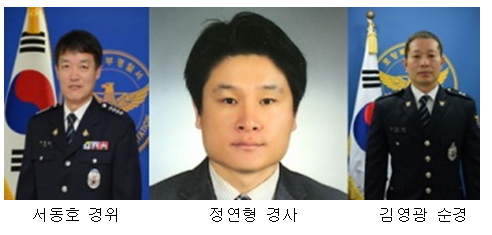 [포항] 포항북부경찰서 여청수사팀(경위 서동호, 경사 정연형, 순경 김영광)은 지난 6월 16일 21시 30경 포항시 북구 영일대 해수욕장 소재 P모텔에서 혼수상태에 있는 김모씨(여, 34세)를 발견해 응급후송 조치함으로써 생명을 구했다.