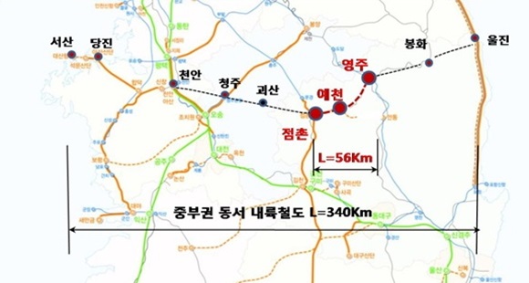 중부권 동서 내륙철도 건설은 충남 서산에서 경북 울진을 연결하는 총 연장 340km, 8조 5천억 원이 소요되는 대형국책사업으로 이미 경북·충북·충남 도지사가 조기착공을 촉구하는 공동건의문을 국토교통부로 제출한 상태이고, 통과노선 지방자치단체인 영주시와 11개 시군에서는 5억 원의 공동예산으로 올해 9월경 사전예비타당성조사 용역을 발주해 객관적인 당위성과 필요성을 확보 후 제19대 대선공약에 반영토록 할 예정이다.