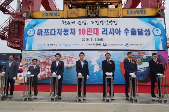 [포항] 포항시는 6월 21일 포항영일만항 컨테이너부두에서 일본 마쯔다자동차의 러시아 수출 10만대 달성 기념식을 가졌다.