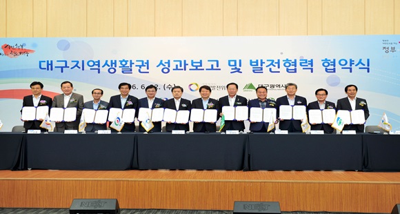 이 날 협약식은 대통령직속 지역발전위원회와 대구광역시가 공동으로 주관하고 군위군을 비롯한 대구시 인근 경북 9개 시·군, 경남 합천군. 창녕군 등 11개 자치단체장이 참석한 가운데 시·군이 서로 도우면서 함께 발전하는 동반자로서 협력과 상생을 위해 공동 노력해나갈 것을 약속하는 자리로 마련됐다.