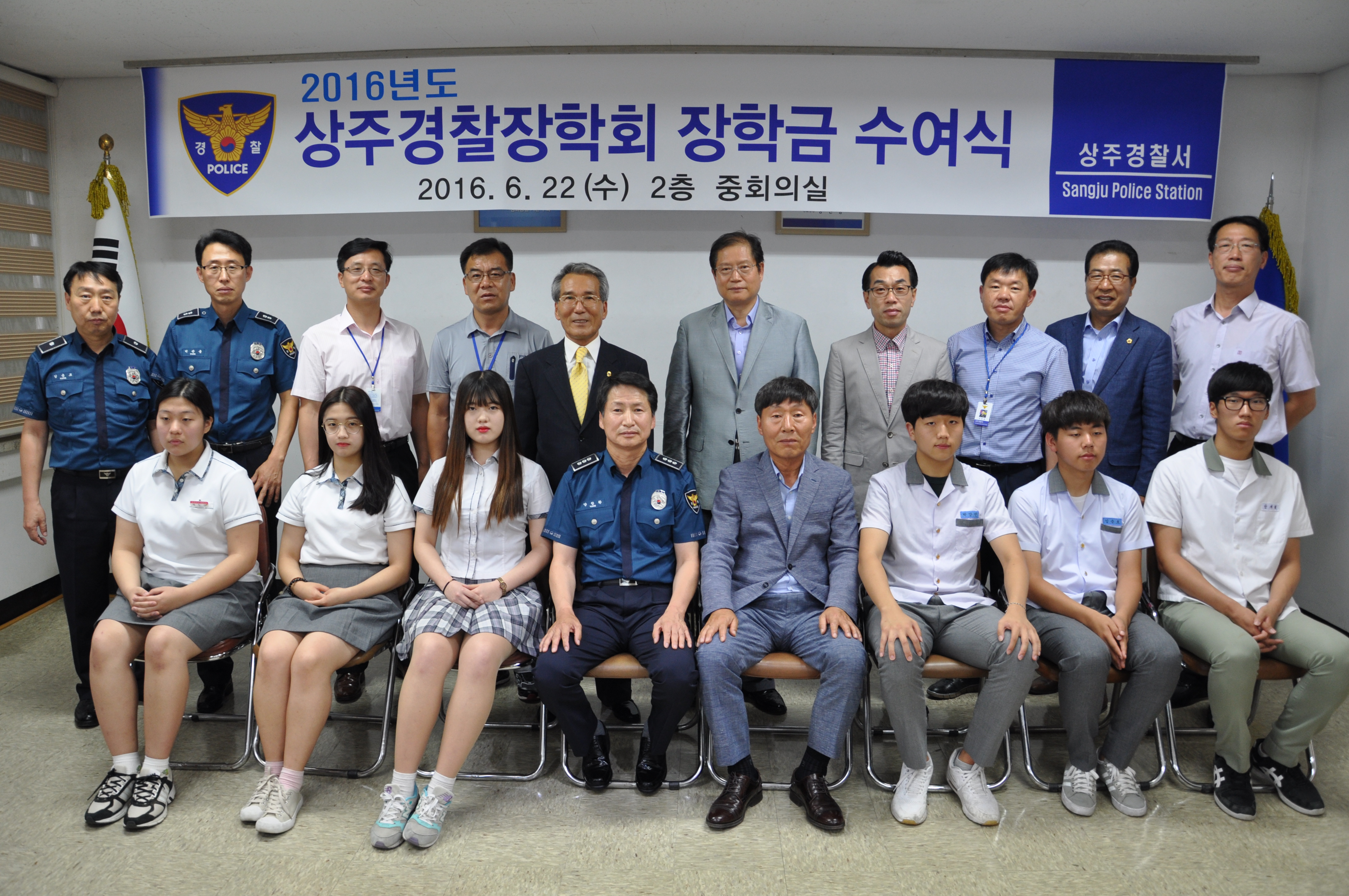 [상주] 상주경찰서는 6월 22일 경찰서 2층중회의실에서 김환권 경찰서장, 과장, 상주경찰장학회 이상춘 이사장과 이사 등 장학금 수상대상 경찰관 자녀들이 참석한 가운데 ‘2016년도 장학금 수여식’을 개최했다.