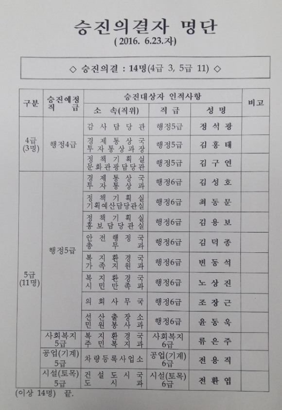 [구미] 구미시가 6월 23일자 승진의결자 명단을 다음과 같이 발표했다.