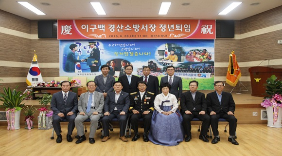 [경산] 이구백 경산소방서장은 6월 28일 경산소방서 대회의실에서 36년여간의 공직생활을 마감하고 명예로운 정년퇴임식을 가졌다.