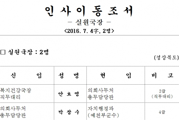 [경북] 경상북도는 7월 4일자 실원국장 2인에 대해 아래와 같이 인사이동 조서를 발표했다.