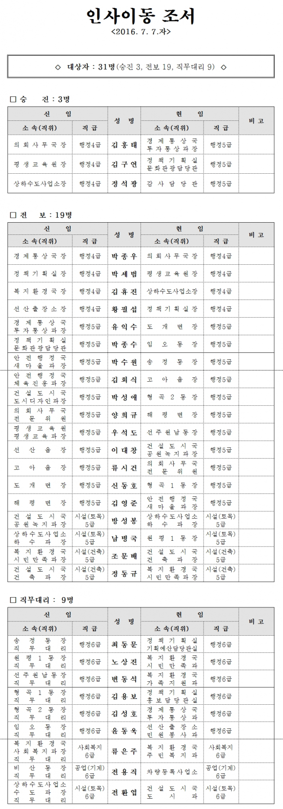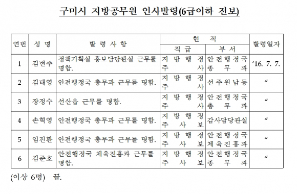 구미시 인사이동 조서 발표