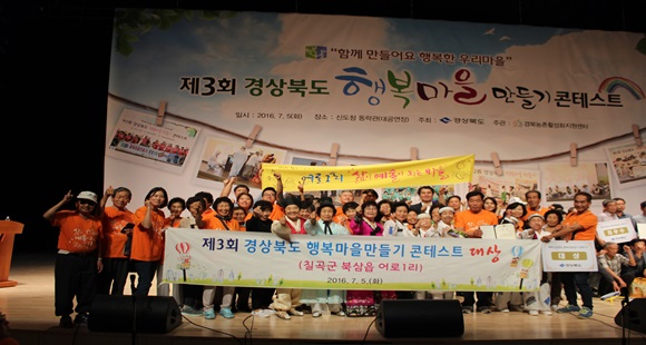 [칠곡] 지난 7월 5일 경상북도 주관으로 열린 ‘제3회 경상북도 행복마을 만들기 콘테스트’ 에서 전체 마을부문에서 북삼읍 어로1리가 대상을 수상하는 쾌거를 이뤘다.