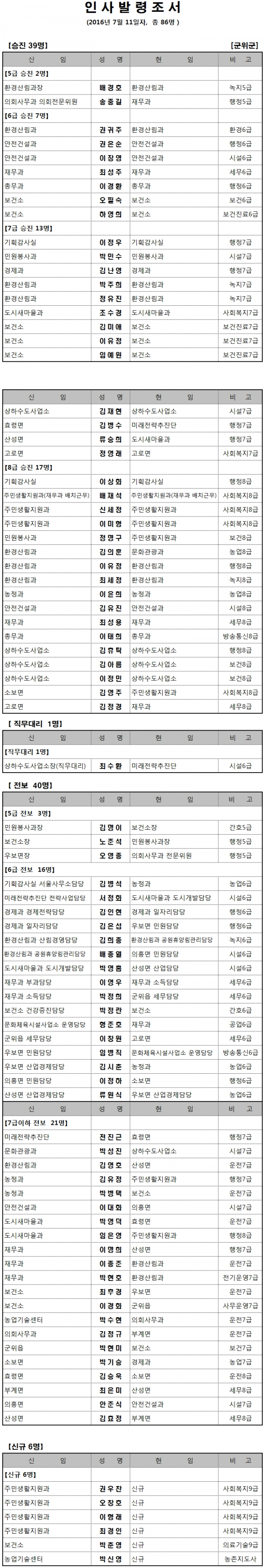 [군위] 군위군은 86명에 대한 7월 11일자 인사발령조서를 아래와 같이 발표했다.
