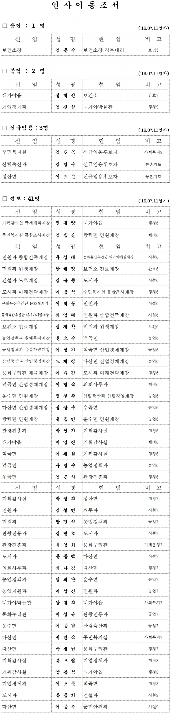 [고령] 고령군은 7월 11일자 인사이동조서를 다음과 같이 발표했다.
