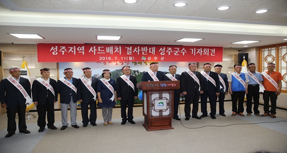 [성주] 성주군과 성주군의회는 7월 11일자 연합뉴스 및 문화일보에 사드 배치 유력 후보지로 성주군이 거론되는 현 시점에 지역주민들이 그 동안 성주읍 내 지척에 위치한 성산포대로 인해 많은 재산적 손실을 묵묵히 감내하고 국가안보에 기여해 왔음에도 불구하고 또다시 성주 군민들의 일방적 희생을 강요하는 한미사드 배치를 강력히 반대한다고 성명서를 발표했다.
