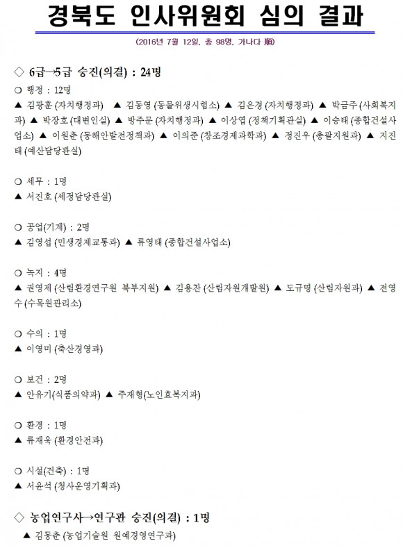 [경북] 경북도 인사위원회는 7월 12일자 98명에 대한 인사위원회 심의결과를 발표했다.
