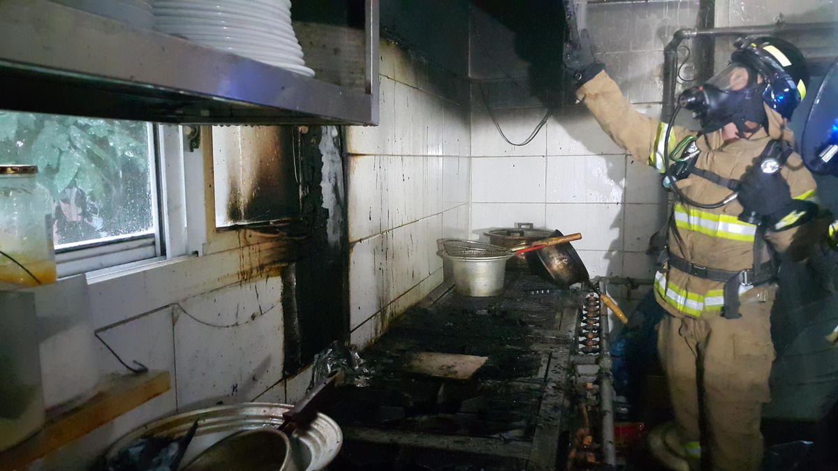 화재는 음식물 조리중 불길이 벽면과 천정의 기름 찌꺼기에 착화 발화된 것으로 추정되며 정확한 화재 원인을 조사중이다. |