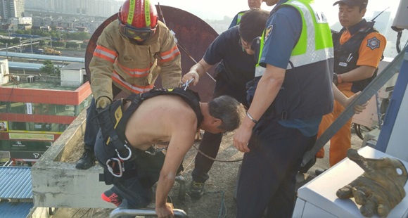 신고 접보 후 119구조대원들이 신속히 현장으로 출동한바 자살 시도자는 건물 옥상에 서있는 상태로 출동한 경찰과 소방대원의 설득 끝에 내려오기로 결심을 했다. 혹시 모를 사고에 대비해 자살 시도자(남,61세)에 안전벨트 착용해 로프를 활용 안전을 확보 후 하층으로 안전하게 구조를 완료했다. |