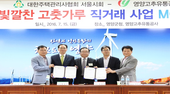 대한주택관리사협회 서울시회는 산하 24개 지부(1,585,000戶)를 두고 있으며 아파트 주민들을 위해 직거래사업으로 저렴한 가격에 우수한 품질의 농산물을 공급하기 위해 산지직거래를 추진하고 있다. 이번 협약체결로 영양고추유통공사에서는 대한주택관리사협회 서울시회에 대한 빛깔찬고춧가루의 공급으로 확대된 시장을 기반으로 더 많은 고객들로부터 좋은 평가를 받을 기회가 되었고 서울시회에서는 질 좋고 맛좋은 고춧가루를 직거래함으로써 아파트 주민들로부터 한층 더 좋은 호응을 기대하고 있다.
