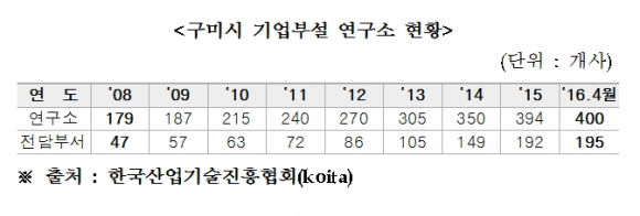 2008년 179개에 불과했던 구미지역 기업의 부설연구소는 2016년 4월 기준 400개로 8년여 만에 2배 이상 급증했으며, 연구전담부서 보유기업도 같은기간 47개에서 195개로 4배 이상 증가했다.