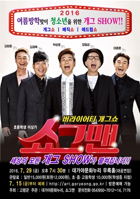 [고령] 고령군은 방학을 맞아 대가야문화누리 우륵홀(대공연장)에서 지역 학생들에게 개그쇼, 매직쇼, 애드립쇼를 다가오는 7월 29일 19시 30분에 공연한다. 쇼그맨은 박성호를 중심으로 5명의 개그맨이 하는 공연으로 개그, 마술, 음악, 연기 등 다채로운 볼거리와 빵빵 터지는 웃음을 제공할 것으로 기대된다.