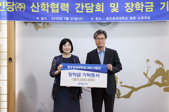 구미산업단지경영자협의회장을 맡고 있는 서인숙 인당㈜ 대표는 “구미산업단지 내 산업체 재직자들의 역량강화와 경쟁력 확보에 도움 되기를 바란다.”며, 장학금 전달의 뜻을 밝혔다. 김영식 금오공대 총장은 “대학 발전과 인재양성을 위해 장학금 기탁의 뜻을 밝힌 인당㈜에 감사드린다.”며, “앞으로도 우수한 학생들의 경쟁력 강화와 지역 산업체와의 동반 성장을 위해 노력하겠다.”고 밝혔다.