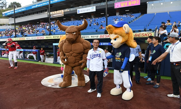 [청도] 이승율 청도군수는 지난 8월 7일 ) 대구삼성라이온즈파크에서 열린 삼성 대 KIA 와의 프로야구경기에서 청도캐릭터인 변신싸움소 바우와 함께 마운드에 등판해 청도인의 화합과 지역 농특산물의 판로확대를 염원하는 멋진 시구를 선보였다.