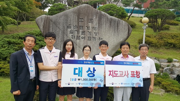 [구미] 경북외국어고등학교 월화수목금통일 팀(이민형, 정다현, 진현우, 최승준)이 지난 8월 12일 서울 양재동 aT센터에서 열린 ‘2016 전국 학생 통일 탐구토론대회’(이하 ‘통일 탐구토론대회’)에서 고등부 대상과 지도교사상(교사 유영혁)을 수상했다.