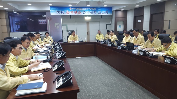 [경산] 경산시는 8월 16일 재난종합상황실에서 ‘2016 을지연습 준비상황보고회’를 개최했다. 이번 을지연습은 22일 공무원 비상소집발령을 시작으로 행정기관 소산훈련·전시직제 편성훈련·전쟁수행기구창설 및 운용훈련을 실시하고, 2일차인 23일에는 전시예산과제토의, 국가중요시설 테러대비 실제훈련, 3일차에는 전시주요현안과제 토의와 민방공 대피훈련, 전투식량시식회가 있으며, 마지막날인 25일에는 문제점 도출과 개선방안을 논의하는 강평보고회를 끝으로 3박 4일간 실시된다. 이날 보고회는 각 부서별로 전시 대비 계획에 대한 사전점검과 준비사항, 사태별 주요 조치계획에 대한 PPT보고와 토론 순으로 진행됐다.
