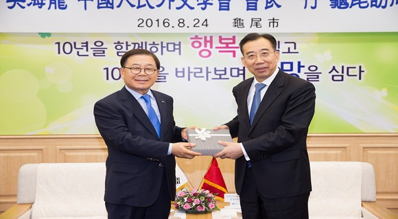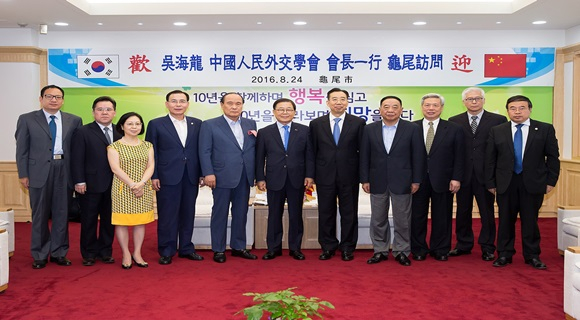 [구미] 중국 고위급지도자들이 구미시를 찾았다. 남유진 구미시장은 8월 24일 구미시청 국제통상협력실에서 제16차 한중 고위지도자포럼 참석을 위해 방한 중인 우하이룽(吳海龍) 중국인민외교학회 회장 일행 25명과 면담의 시간을 가지고 한중 지방정부 간 협력강화 및 교류증진 방안 등 공동 관심사에 대해 의견을 나눴다.